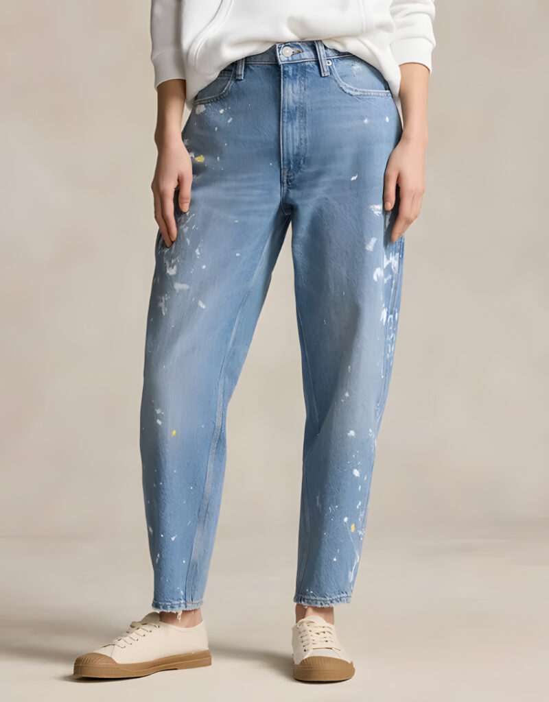 Curved Tapered Jeans high-waisted jeans are defined by a paint-splatter motif and a timeworn medium wash with hand-sanding and grinding on the seams.