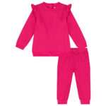 Pink tracksuit for girls made from soft cotton, the sweatshirt has ruffled trims on the shoulder and fastens with buttons at the back. It features Matching joggers with elasticated waistband for a comfortable fit.