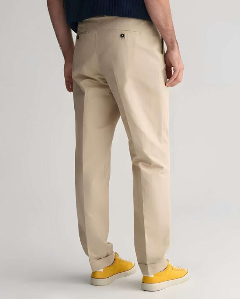 regular fit Pants with a mid-rise waist, these pants feature a tapered leg with a turn-up hem.